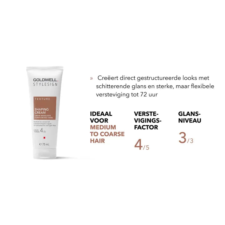 Goldwell Stylesign Shaping Cream 75 ml voegt een trendy nieuwe textuur toe aan elke haarstijl, van glanzend en glad tot stoer en warrig. Het biedt langdurige looks met een hoge weerstand tegen luchtvochtigheid tot 72 uur.
