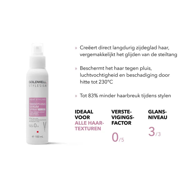 De Goldwell Stylesign Smoothing Serum Spray zorgt direct voor langdurig zijdezacht haar en verbetert het glijden van de stijltang. Het beschermt tegen hitte tot 230°C en voorkomt pluis en luchtvochtigheid, waardoor je haar de hele dag glad en glanzend blijft.