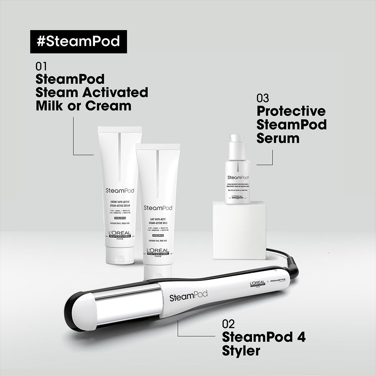 L’Oréal heeft gedacht aan alles wat je nodig hebt en heeft speciale producten ontworpen die perfect samenwerken met de Steampod 4.0. Voordat je begint met stylen, is het essentieel om altijd een hittebeschermer te gebruiken. Denk aan de L’Oréal Steampod Smoothing Milk voor fijn haar of de L’Oréal Steampod Smoothing Cream voor dik haar.