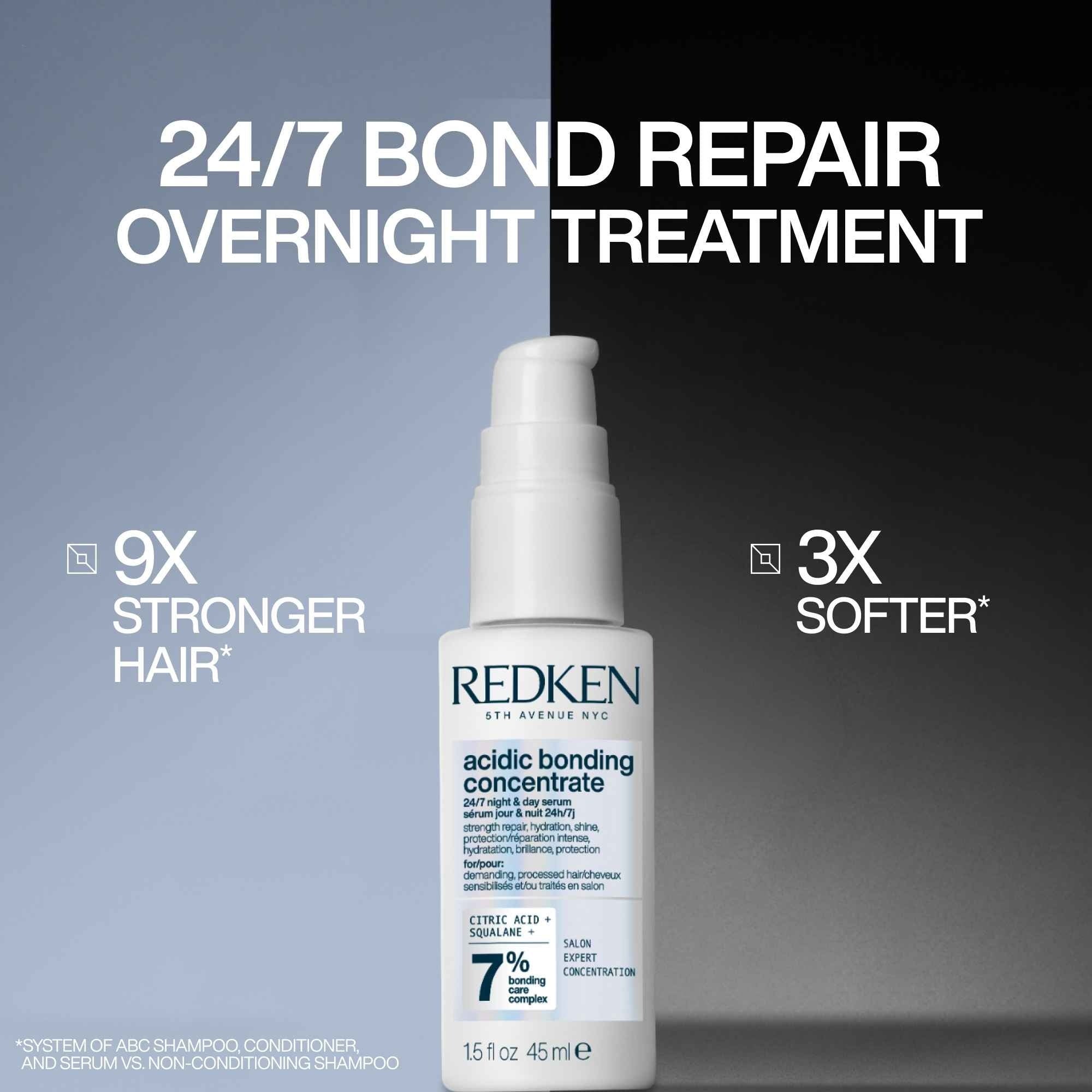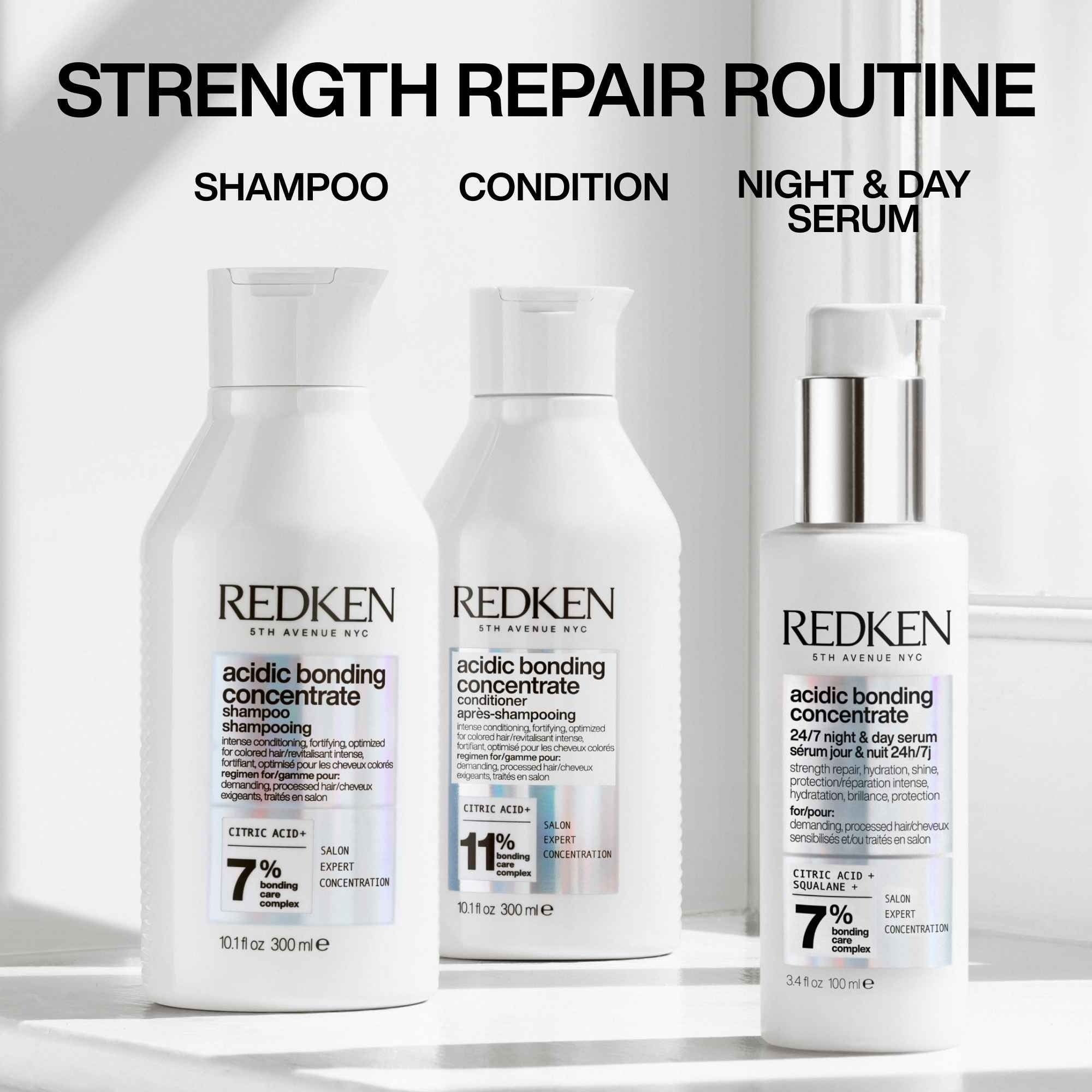 Redken Acidic Bonding Concentrate 24/7 Night & Day Serum is een baanbrekend bonding serum dat je haar zowel 's nachts als overdag intensief regenereert en beschermt. Het serum, verrijkt met citroenzuur en polyglutaminezuur, versterkt de haarvezels diep van binnen en biedt langdurige bescherming tegen dagelijkse schadelijke invloeden. Geschikt voor alle haartypes, herstelt dit leave-in serum beschadigd haar en zorgt voor een zichtbaar gezondere uitstraling.