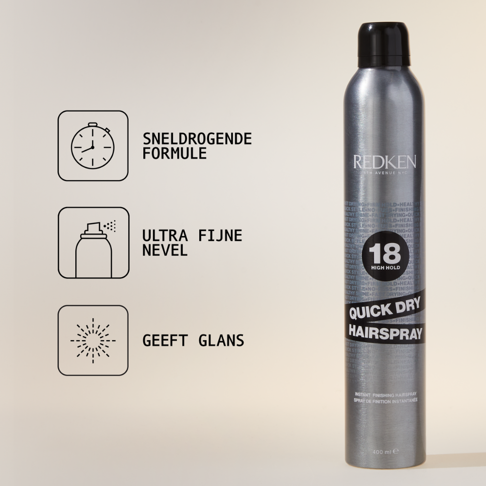 De Redken 18 Quick Dry Hairspray 400 ml is een finishing spray die snel opdroogt in het haar. Dankzij de langdurige hold blijven je haren gedurende de hele dag perfect in model. Deze spray zorgt voor een gecontroleerde afwerking met een gezonde glans, en is ook bijzonder geschikt voor opgestoken kapsels.
