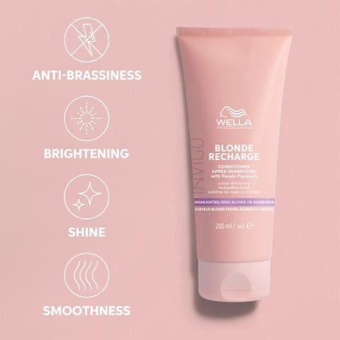 De Wella Invigo Blonde Recharge Conditioner is een zilverkleurige conditioner die de intensiteit van de haarkleur verfrist en versterkt. De rijke formule van de conditioner bevat pigmenten die de gele tonen in het haar neutraliseren en het haar extra intensief verzorgen. Bovendien zorgt de conditioner ervoor dat het haar heerlijk zacht aanvoelt.