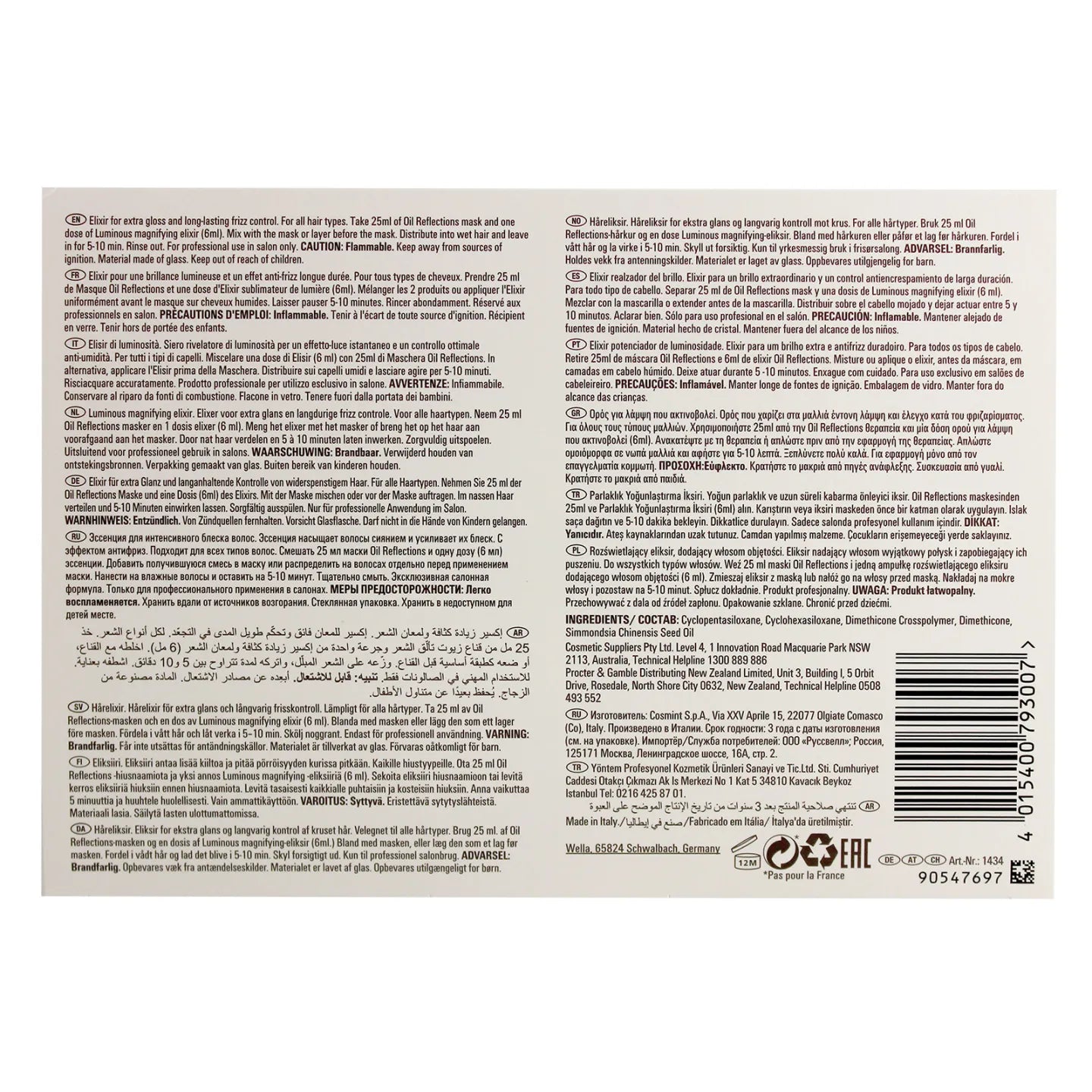 Wella Oil Reflections Elixir Treatment is een haarbehandeling die zorgt voor extra glans en gladheid, en langdurige controle over pluizig haar. Deze behandeling bevat cameliaolie en extracten van witte thee. Het zorgt voor een glad en reflecterend oppervlak van het haar, waardoor het haar tot wel 3 keer gladder wordt en direct een prachtige glans krijgt. De Elixir bevat jojoba olie en witte thee extracten voor een oogverblindende glans en optimale anti-pluis controle.