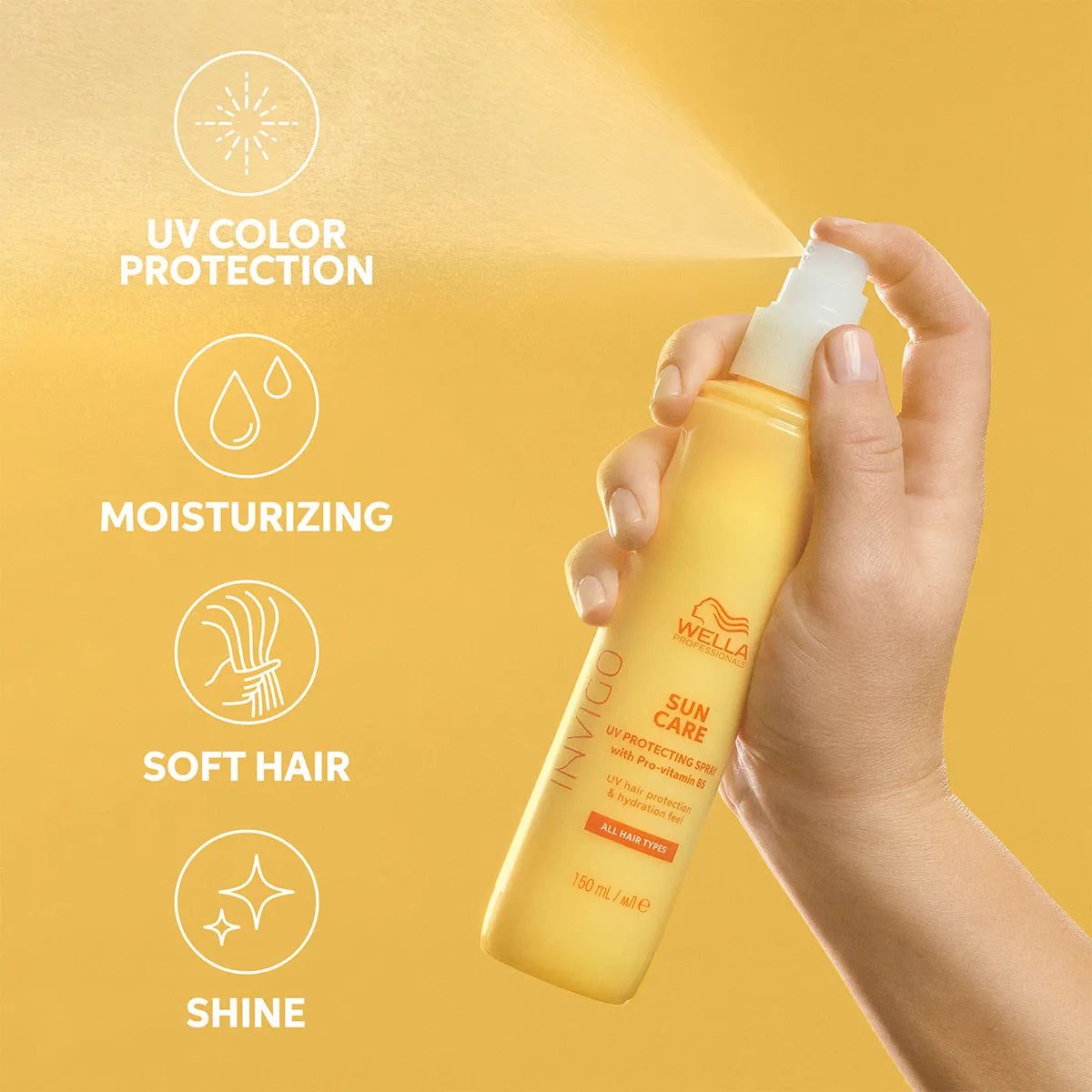 Wella Sun Color Protection Spray is een leave-in spray die speciaal is ontworpen voor gekleurd haar en beschermt tegen de schadelijke effecten van zonlicht. Deze innovatieve tweefasenspray bestaat uit twee delen: fase 1 beschermt het haar effectief tegen UV-straling, terwijl fase 2 zorgt voor hydratatie dankzij het toegevoegde vitaminecomplex. Wella INVIGO Sun Color Protection Spray laat het haar er gezond uitzien en zijdezacht aanvoelen. Met deze verzorgende haarspray straalt je haar nog meer dan de zon.